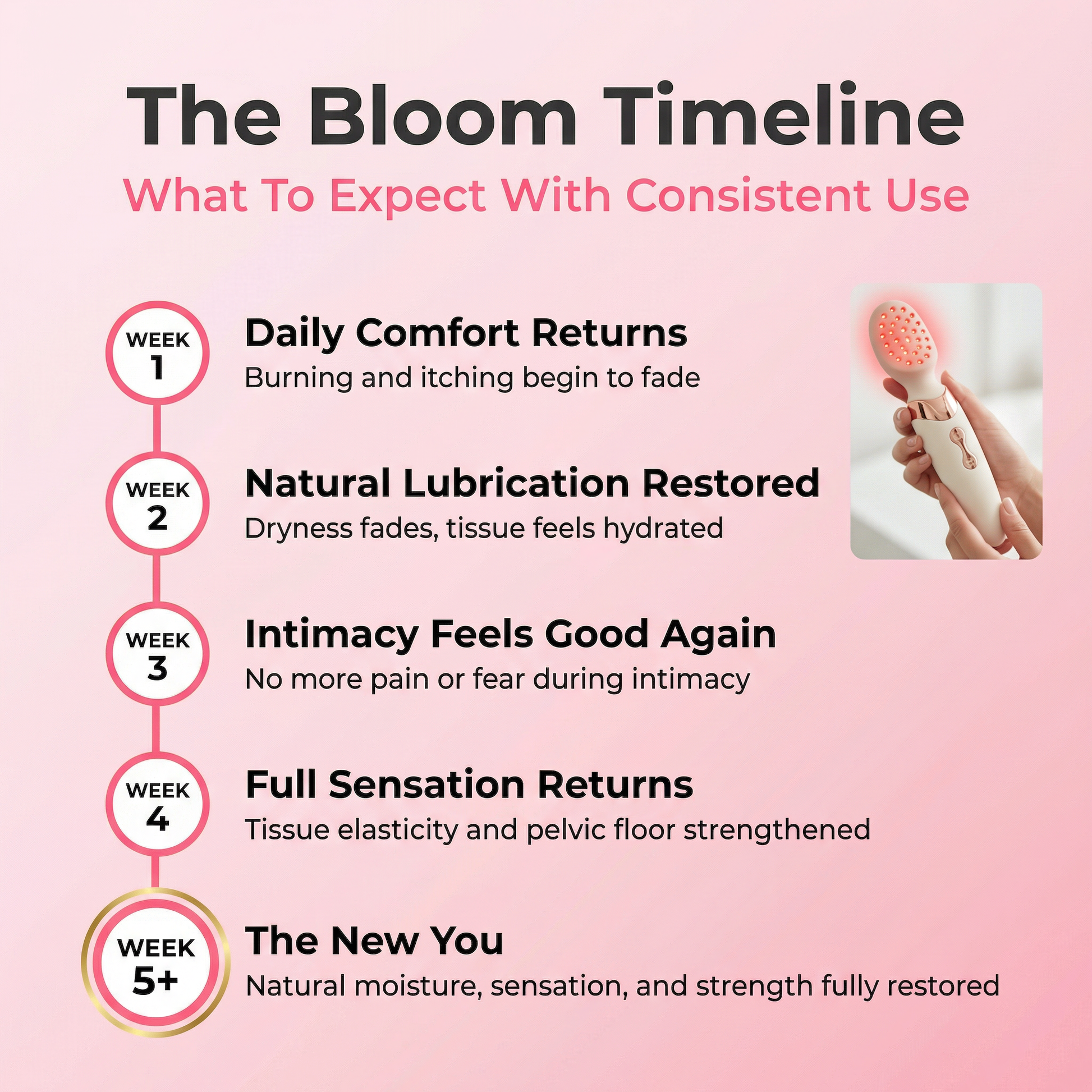 women get through a full session dry for the first time. Weeks 5–6 — Consistent results. Most women report